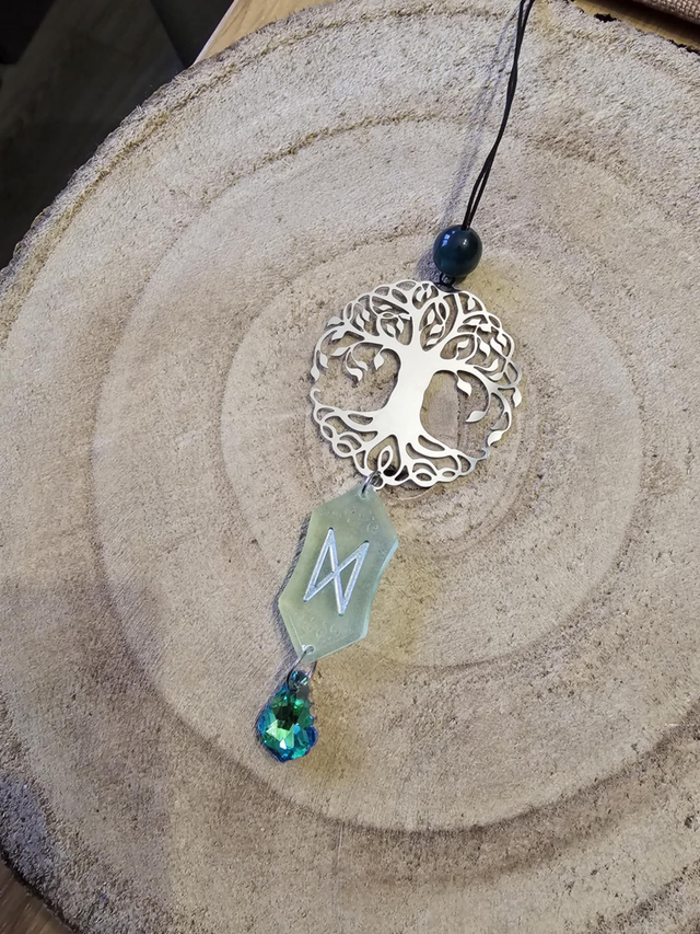 Suspension "Arbre de Vie runique" Création artisanale unique, mêlant symbolique ancestrale et éthique moderne. Rune du vieux Futhark coulée en résine biosourcée, pampille colorée ornée d’une perle.
