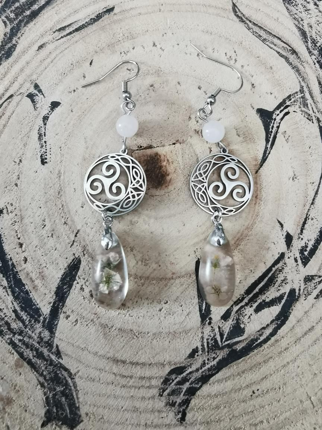 Triskels argent, quartz rose et fleurs roses